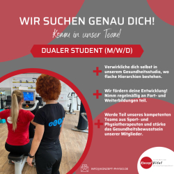 Wir bieten ein modernes Gesundheitsstudio mit digitalen und funktionellen Geräten, der Schwerpunkt der Arbeit liegt bei uns in der Betreuung und im Gesundheitssupport unserer Mitglieder. Die enge Zusammenarbeit mit der Physiotherapie macht die Arbeit noch spannender. Wir sind ein Studio mit sehr engem und persönlichen Betreuungsansatz. Ergänzt wird deine Arbeit durch Spezialisten im Bereich Training, Fitness, Ernährung, Rehasport und Physio. Die Betreuung deines Studiums wird im Rahmen eines Mentorings von uns durchgeführt - du hast einen kompletten Studi-Tag in deiner Woche, an dem du dich ausschließlich auf die Inhalte deines Studiums konzentrieren darfst. Übungen werden nachbesprochen bzw. in Blöcken auch gemeinsam erarbeitet.